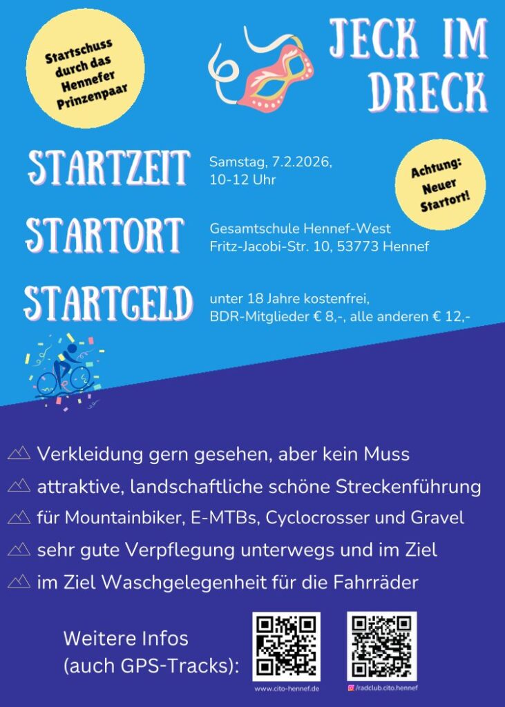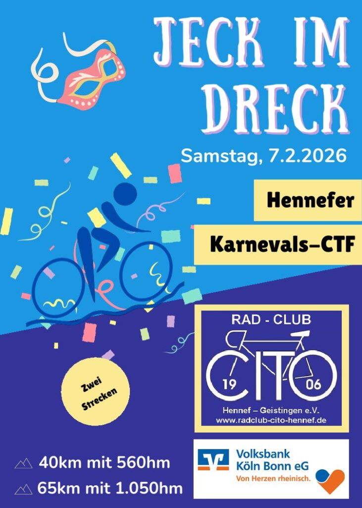 der Radclub CITO 1906 Hennef-Geistingen e.V. veranstaltet am Samstag, den 7. Februar 2026, seine 6. traditionelle Karnevals-CTF (Country-Touren-Fahrt). Ich seid herzlich eingeladen, an dieser besonderen Kombination von Radsport und Karneval teilzunehmen. Bringt gute Stimmung, vielleicht auch ein Kostüm mit und feiert mit uns. Wir hoffen auf schönes Wetter wie in 2025. Den Startort aus dem Jahr 2025 haben wir wegen der eingeschränkten Parkmöglichkeiten nicht mehr beibehalten, sondern sind wieder zur Gesamtschule West, Fritz-Jakobi-Str. 10, 53773 Hennef zurück gekehrt. Viele von euch kennen die Location aus den Vorjahren. Hier haben wir auch größere Raummöglichkeiten für den Fall, dass wir schlechtes Wetter haben sollten und ihr danach geschützt bei lecker Speis und Trank verweilen wollt.
