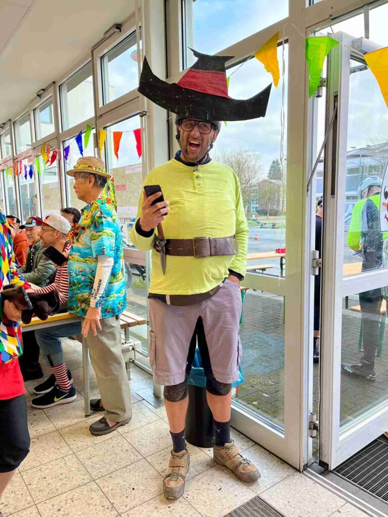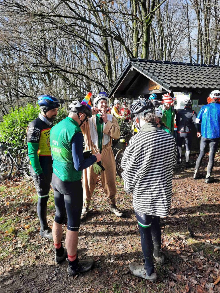Rund 400 Radsportbegeisterte – die überwiegende Anzahl mit Karnevalskostümen – ließen sich von den aufgeweichten Waldwegen nicht abhalten und kamen wieder gut gelaunt und zahlreich nach Hennef um das Motto „Jeck im Dreck“ mit Leben zu füllen. Sehr erfreulich war, dass einige „Jecken“ sogar eine längere Anfahrt aus dem Raum Koblenz, Gießen, Duisburg und dem Münsterland auf sich genommen hatten. Wir werten dies als Zeichen, dass sich unsere Veranstaltung langsam auch über die Grenzen des Rheinlandes herumspricht. Dies freut uns gerade im Jahr des 120jährigen Bestehens des Radclubs CITO natürlich sehr.