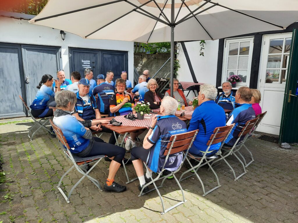 Das schöne und warme Frühlingswetter, das Gemeinschaftsgefühl in einer großen Gruppe (16 Mitglieder in Zweierreihe) zu fahren und die angenehmen Gespräche prägten die Ausfahrt von Beginn an und sorgten für gute Stimmung. Dazu kam eine von Rolf M. sorgfältig ausgewählte Strecke, die den Wünschen der L1 und der L2 gerecht werden sollte. Gefahren wurden ca. 73 km und 750 hm ins Bergische Land (Rösrath, Much, Neunkirchen), die in der Linde in Happerschoß endete. Dort trafen sich die L1 und L2 – Fahrer/innen mit den Mitgliedern der CITO-Wandergruppe, so dass insgesamt rd. 20 Mitglieder des CITO zum gemütlichen Teil übergingen. Das Team von Wolfgang (Wirt der Linde) versorgte uns wieder mal sehr gut mit kühlen Getränken und der traditionellen Grillwurst im Brötchen (oder für unsere Vergetarier mit Käsebrötchen). Hier wurde die Tour nochmal intensiv aufgearbeitet. Zum längeren Verweilen trug auch der angenehm warme Tag, der Sonnenschein sowie die interessanten Gespräche bei.